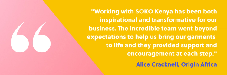 SOKO Community Trust — strives to develop and enhance the social, environmental and economic skills of local communities through a variety of workshops and training. The Community Trust also runs the Stitching Academy and our female sexual health programme, the Kujuwa Initiative, working to reduce period poverty in Kenya.